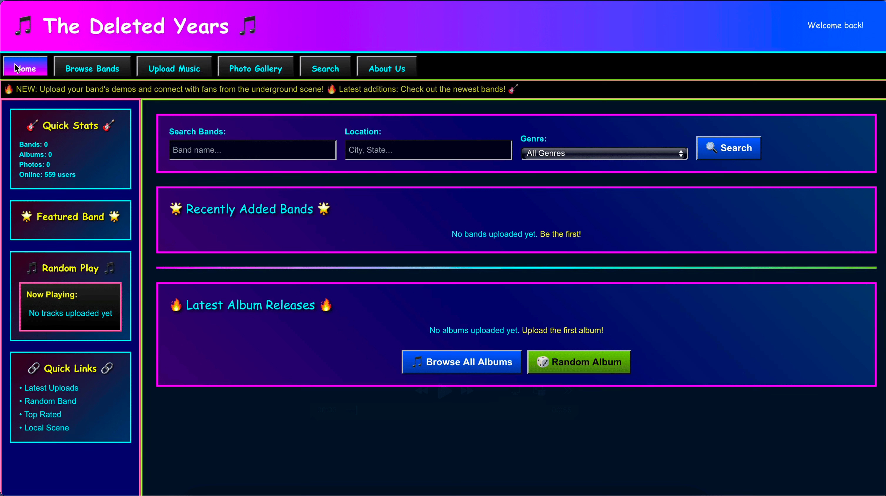 The site is modeleld after the old MySpace look and feel, since that was the defacto hub of the internet in that era (Facebook didn’t really start taking off until around 2009 or so) and aside from ReverbNation, it’s where so many of us “lived” at the time.